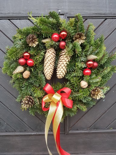 Wieniec wykonany z gałązek żywej jodły. Jako dekoracji użyto: czerwone bombki, złote szyszki sosnowe(pomalowane sprayem), szyszki świerkowe, orzechy włoskie oraz wstążki.
