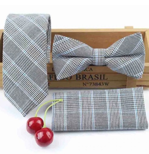 Мужской галстук-бабочка и галстук и карман квадратный, серый в клетку