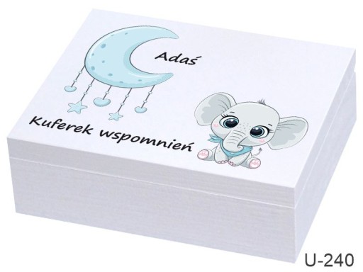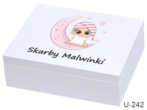 Drewniane pudełko z zewnątrz malowane na biało wieko z kolorowym nadrukiem bezpośrednio na pudełku , personalizacja IMIĘ