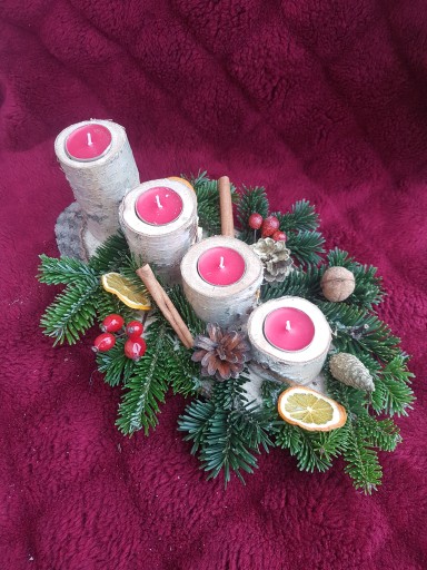 Stroik świąteczny wykonany z naturalnych składników (w znaczącej większości) wspaniale udekoruje dom, ożywi go i ubogaci swoim zapachem, a domowników wprowadzi w cudowny nastrój oczekiwania na Święta. Taki wieniec może pozostać na stole na czas Wigilii, jak również na cały okres Bożego Narodzenia. Super sprawdzi się też w roli prezentu świątecznego. Długość stroika to ~30 cm, a szerokość ~15cm.
