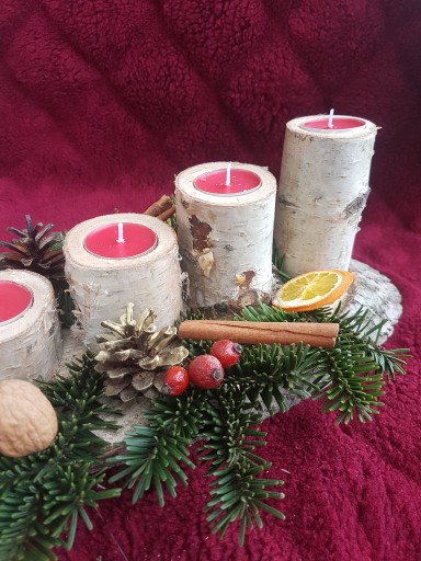 Do wykonania stroików użyte zostały następujące naturalne surowce: pniaczek drzew: olchy i brzozy, świeże gałązki jodły, szyszki sosny i świerku, orzechy włoskie, suszone owoce jarzębiny, suszone plasterki pomarańczy. Dekorację główną stanowią cztery świeczki, symbolizujące cztery niedziele adwentu, które mają swoje, bezpieczne miejsce w stroiku, umieszczone na naturalnych świecznikach różnej wysokości. Można je spokojnie zapalić, a nawet bez problemu wymienić.