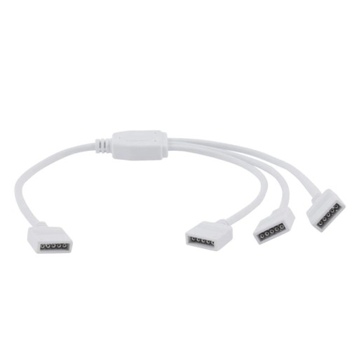 Złączka pozwala na połączenie trzech odcinków taśmy RGBW pod jeden sterownik bez konieczności lutowania. Szybkozłączki stosuje się w rozbudowanych układach RGB. Wszystkie zakończenia są żeńskie - w zależności od konfiguracji można zastosować dodatkowe złączki męskie 5-PIN.