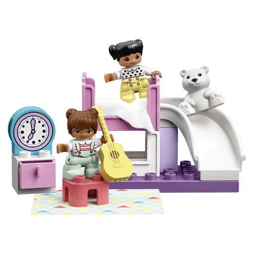 Sypialnie nie służą tylko do spania, prawda? Z tym pełnym atrakcji zestawem zabawa nigdy się nie skończy! Dołącz do pidżama party wyprawionego przez dwie figurki dziewczynek w pokoju z łóżkiem piętrowym. Możesz przytulić się do ogromnego pluszowego misia, zaśpiewać coś przy akompaniamencie gitary lub zjechać z górnego łóżka po zjeżdżalni! Gdy zegar wskaże, że pora już spać, połóż dziewczynki do łóżka. Potem urządź im pobudkę — radosna zabawa może toczyć się dalej od samego rana! • Opakowanie zestawu ma kształt domku, dzięki czemu można zamienić je w intrygującą sypialnię wypełnioną kolorowymi zabawkami i ciekawymi figurkami, które zapewnią maluchom niezliczone godziny pomysłowej zabawy w odgrywanie ról. • Ten edukacyjny zestaw do budowania dla małych dzieci zawiera dwie figurki dziewczynek o współczesnym wyglądzie, a do tego zabawkową gitarę, budzik i sympatycznego pluszowego misia. Dodatkowo opakowanie w kształcie domku nadaje się nie tylko do przechowywania klocków, ale i do zabawy. • Podczas zabawy w pidżama party z dwiema figurkami dziewczynek z zestawu LEGO® DUPLO® Sypialnia maluchy wzmacniają koordynację wzrokowo-ruchową i ćwiczą wymyślanie oraz odgrywanie pomysłowych historyjek. Ciężko będzie przerwać zabawę, gdy nadejdzie czas na spanie! • Podczas zabawy w udawanie z dwiema figurkami dziewczynek z zestawu LEGO® DUPLO® Sypialnia maluchy wzmacniają koordynację wzrokowo-ruchową i ćwiczą wymyślanie oraz odgrywanie pomysłowych historyjek. Połączenie modelu z zestawem LEGO DUPLO Miasteczko: Pokój zabaw (10925) da jeszcze więcej kreatywnych możliwości. • Szukasz zabawki edukacyjnej dla małego dziecka? W tym zestawie znajdziesz urocze postacie, barwne i łatwe do chwycenia klocki oraz niezliczone możliwości zabawy. To rewelacyjny pomysł na rozwijający prezent dla dwulatka lub starszego dziecka. • Łóżko piętrowe ze zjeżdżalnią ma ok. 11 cm wysokości, 13 cm szerokości i 6 cm głębokości. Pudełko w kształcie domku zmieści wszystkie klocki i elementy, dzięki czemu tę kreatywną zabawkę dzieci mogą mieć zawsze przy sobie. • Zestaw nie wymaga baterii. Zabawki bez elementów elektronicznych rozwijają wyobraźnię i kreatywność dzieci oraz ich umiejętności praktyczne, a satysfakcja z własnoręcznego robienia ciekawych rzeczy sprawia, że maluszki nie będą miały ochoty przerwać zabawy. • Zabawa zaczyna się natychmiast — wystarczy otworzyć pudełko w kształcie domku! Szukasz kolejnych pomysłów na naukę poprzez zabawę? Wypróbuj kołysanki LEGO® DUPLO® i inne piosenki ze strony LEGO.pl/DUPLO/Songs. • Zabawki z serii LEGO® DUPLO® Miasteczko zapewniają maluchom i przedszkolakom narzędzia do nauki poprzez pomysłową, swobodną zabawę. Te niekonwencjonalne zestawy początkowe DUPLO łączą w sobie korzyści dla rozwoju dziecka ze wspaniałą zabawą, którą maluchy uwielbiają. • Zestawy LEGO® DUPLO® spełniają najwyższe standardy branżowe. Dzięki temu maluszki mogą z łatwością chwycić, złączyć i rozłączyć klocki — i tak jest niezmiennie od 1969 roku! • W Grupie LEGO upuszczamy, zgniatamy, skręcamy, podgrzewamy, gryziemy, zginamy, zarysowujemy i rozciągamy klocki i elementy LEGO® DUPLO®, by mieć pewność, że każdy z naszych zestawów konstrukcyjnych dla dzieci spełnia najwyższe światowe standardy bezpieczeństwa i jakości.