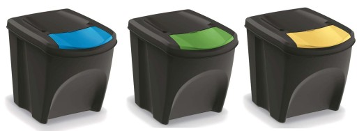 Zestaw koszy do segregacji śmieci 3x25l Sortibox pozwoli nowocześnie posortować Państwa śmieci. Pojedynczy kosz ma kształt i rozmiar pozwalający na ukrycie go w szafce pod zlewozmywakiem, natomiast ustawione trzy kosze jeden na drugim można umieścić w otwartej przestrzeni kuchni, garażu czy spiżarni.