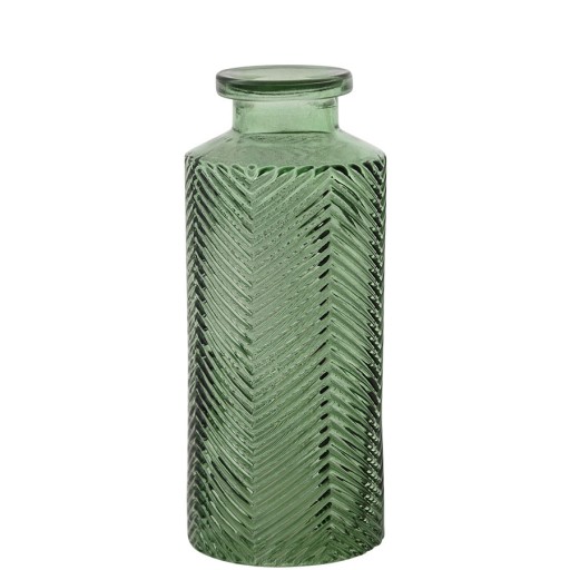 Wazon w kształcie kanciastej butelki wykonany z zielonego szkła z prostym, minimalistycznym, tłoczonym wzorem na ściankach. Z serii szklanych wazonów znajdziecie u nas wiele ciekawych modeli, które wspólnie mogą stanowić ciekawy dodatek do każdego wnętrza.