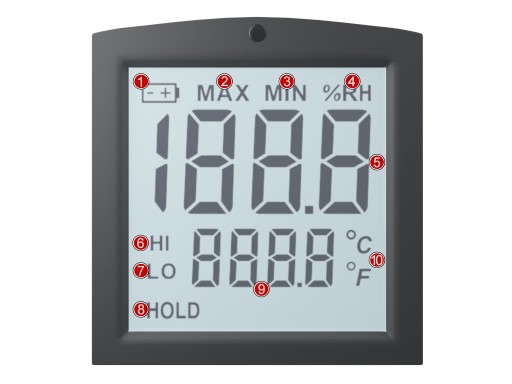 - Dokładność: 1.0°C (-30°C - +0°C), 0.5°C (0°C - +70°C), 1.8°F (-22°F - +32°F), 0.9°F (32°F - +158°F)