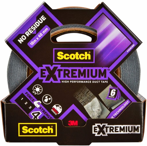 Taśma naprawcza Scotch® Extremium™ NO RESIDUE High Performance (18,2 m x 48 mm) jest silna i odkleja się bez pozostawiania śladów nawet po 6 miesiącach od nałożenia. Nadaje się do zastosowań tymczasowych i długotrwałych, może być używana wewnątrz i na zewnątrz, a także łatwo rozrywa się bez użycia nożyczek.