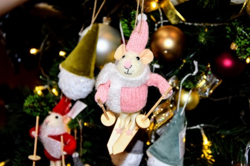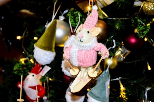 Urocza zawieszka różowo - białej myszki stanowić będzie piękną ozdobę choinkową.