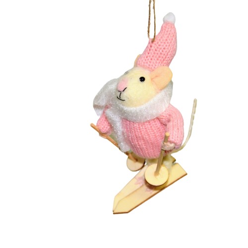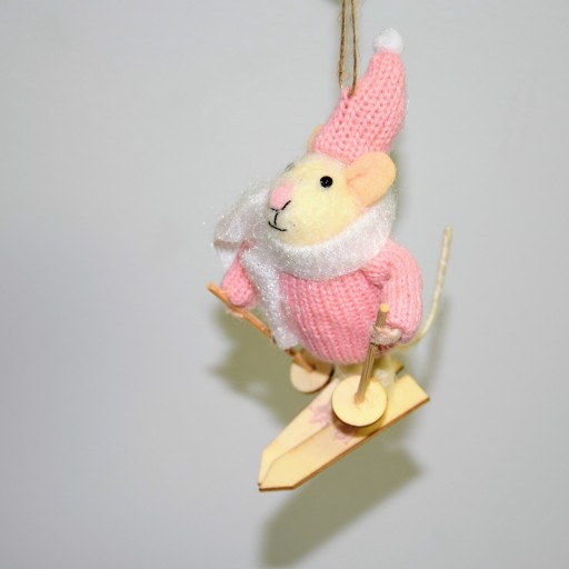 УКРАШЕНИЕ РОЖДЕСТВЕНСКОЙ ЕЛКИ МЫШКА ЛЫЖИ РОЗОВЫЙ И БЕЛЫЙ 11 СМ