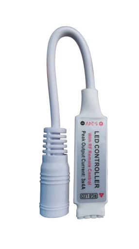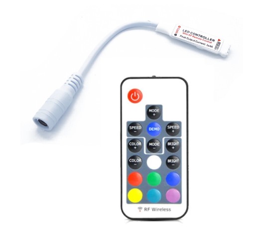 Sterownik obsługiwany za pomocą pilota do sterowania oświetleniem taśm LED RGB. Możliwość zmiany kolorów, trybów dynamicznych, prędkości oraz regulacji jasności. Dzięki komunikacji pilota z kontrolerem za pomocą fal radiowych nie ma potrzeby celowania pilotem w kierunku sterownika.