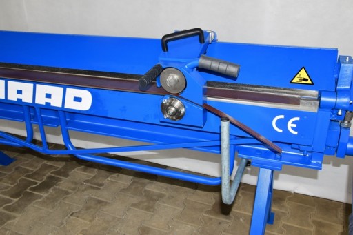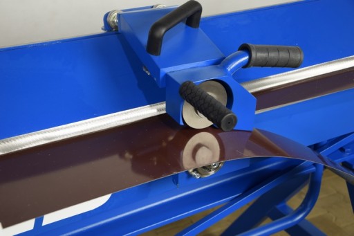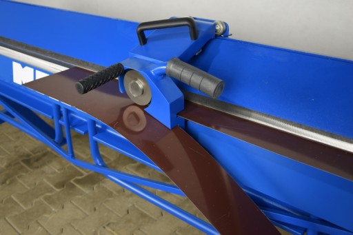 Belka dociskowa jest tak skonstruowana, że jej górna część stanowi jedną z prowadnic dla nożyc krążkowych. Drugą prowadnicą jest belka gnąca zaginarki. Blachę tniemy, po uprzednim jej zamocowaniu na zaginarce.