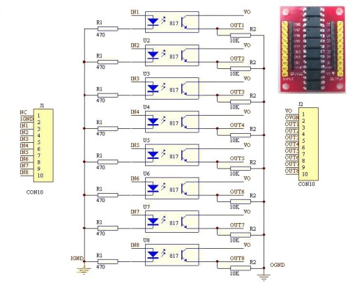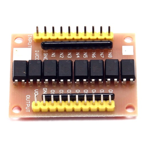 Moduł 8 kanałowego izolatora zbudowanego w oparciu o optoizolatory EL817. Optoizolator można wykorzystać w zastosowaniach analogowych lub cyfrowych. Optoizolacja El817 zapewnia izolację galwaniczną do napięcia 5kV.