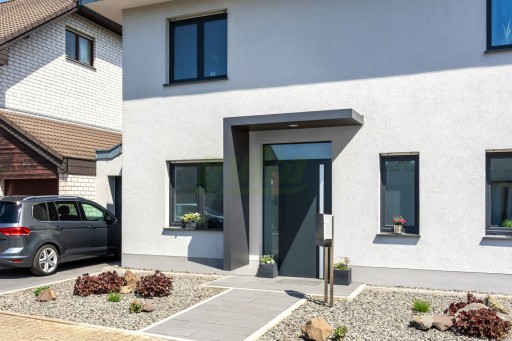 Niemiecki standard dotyczący osłony drzwi. Daszek nad drzwiami wejściowymi Guttavordach BS jest wykonany z aluminiowej ramy malowanej proszkowo, wnętrze zadaszenia wypełnione jest płytą EPS, która tłumi hałas podczas deszczu. Ponadczasowo elegancki design podkreśla specjalny akcent twojego wejścia do domu.