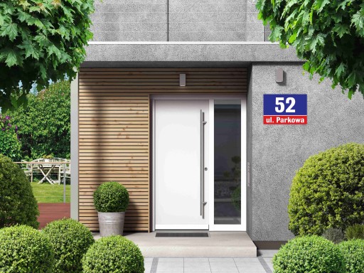 Tabliczka/adresówka z numerem na dom oraz z nazwą ulicy lub miejscowości.