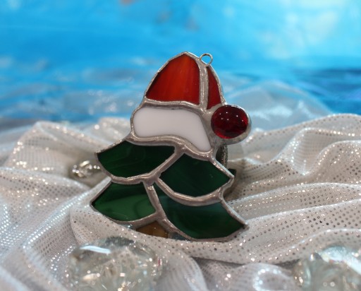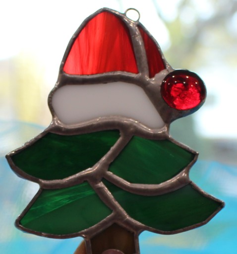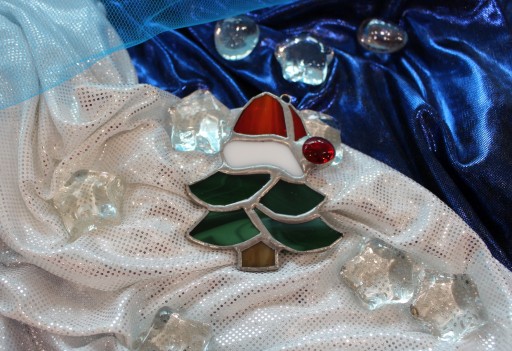 Witrażowa choinka ze szkła różnych kolorów.