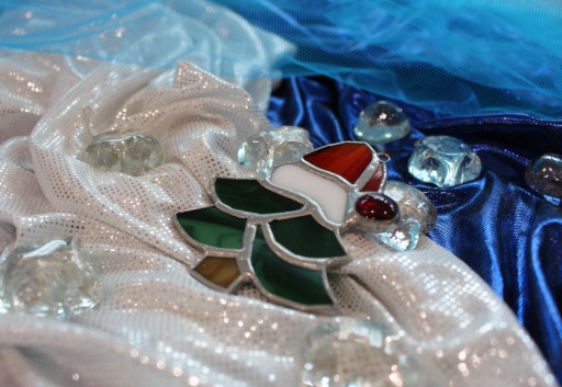 Szkło wycinane jest ręcznie i połączone miedzią oraz cyną. zawieszka wykonana jest z miedzianego ocynowanego drutu.