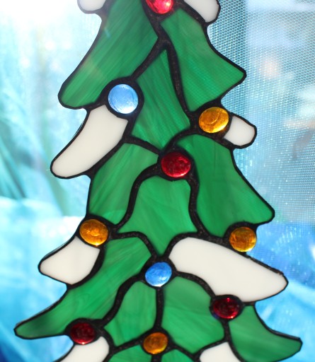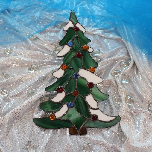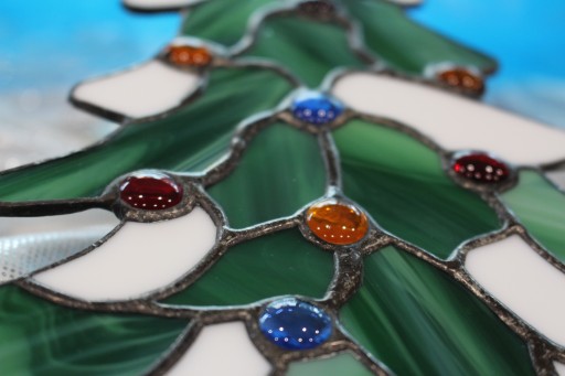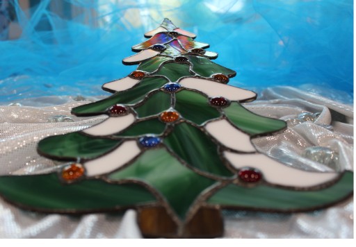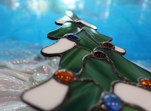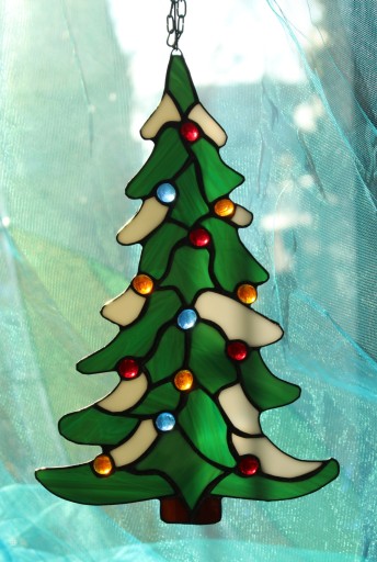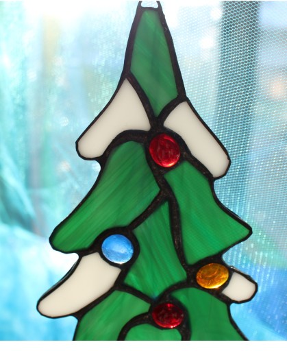 Przedmiotem aukcji jest witraż w kształcie choinki świątecznej.