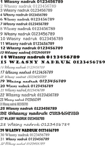 - W ofercie przestawiliśmy przykładowe czcionki do wyboru, lecz jeśli chcesz abyśmy wykonali nadruk Twoją czcionką wyślij nam ją na e-mail w formacie TTF