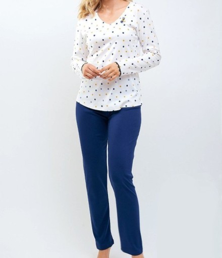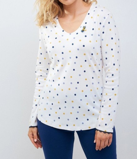 Piżama damska z delikatnej bawełny. Bluzka w groszki, z długim rękawem - mankiety wykończone ażurową koronką. Dekolt w kształcie litery V ozdobiony satynową kokardką. Do kompletu długie, jednolite spodnie w kontrastującym kolorze.