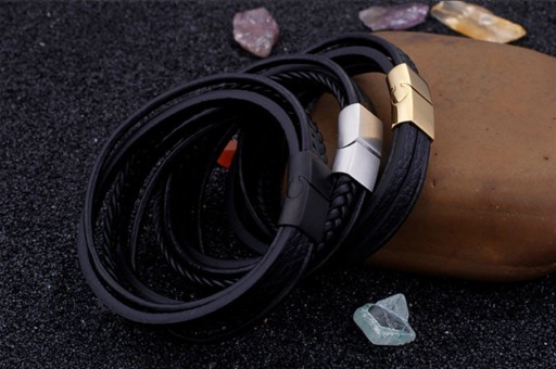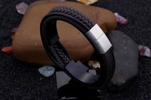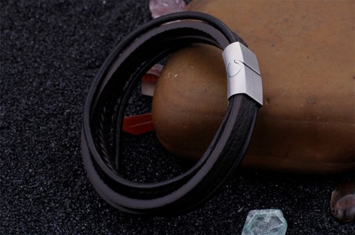 Oferujemy Państwu elegancką bransoletkę wykonaną z wysokiej jakości skóry PU oraz stali chirurgicznej 316L, często nazywanej stalą jubilerską, stalą nierdzewną lub stalą szlachetną. Produkt składający się ze skórzanych pasków i przeplatanych rzemyków, co tworzy niebanalny i oryginalny efekt. Bransoletka posiada komfortowe zapięcie na magnes o matowym, szczotkowanym wykończeniu, które można poddać personalizacji. Całość prezentuje się stylowo i nieszablonowo. Produkt stworzony z największą dbałością o detale oraz niesamowitą precyzją w taki sposób, aby jak najbardziej zwiększyć komfort jej użytkowania. Z pewnością wpasuje się w gust nawet wymagających odbiorców oraz będzie świetnym i trafionym prezentem.