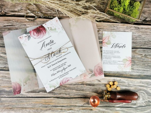 - format zaproszenia 12 cm x 17 cm + 1 bilecik 8,5 cm x 11,5 cm