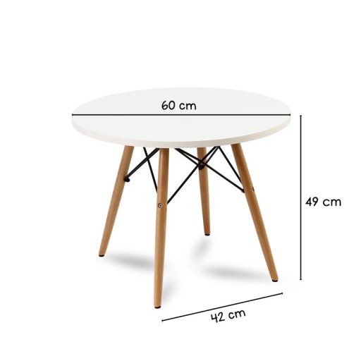 Blat stołu wykonany jest z MDF i pomalowany na biało. Podstawa wykonana jest z drewna bukowego. Idealny do wnętrz w stylu skandynawskim, choć uniwersalny design sprawia, że zaspokoi różnorodne gusta i upodobania stylistyczne.