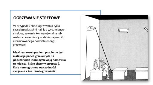System ogrzewania promiennikami ciepła charakteryzuje się tym, że ciepło wytwarzane jest dokładnie tam, gdzie jest potrzebne. Jednocześnie nie trzeba ponosić kosztów związanych ze zbędnym przesyłem energii i stratą ciepła. Ciepło wytwarzane przez promienniki dociera szybko i równomiernie do wyznaczonej strefy grzewczej. Dzięki odpowiedniemu doborowi produktu mamy pewność nie tylko długotrwałego działania, ale komfortu i przede wszystkim, szybkiego zwrotu inwestycji.