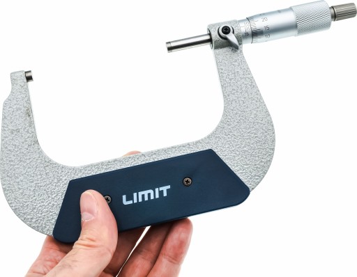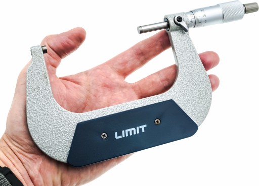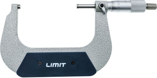 Odkuwany kabłąk i chromowana na mat podziałka. Hartowane wrzeciono o średnicy 6,5 mm z dokładnie docieranymi powierzchniami pomiarowymi z węglików spiekanych. Z tuleją sprzęgła i dźwigienką ustalającą. Zgodny z normą DIN 863.