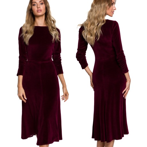 Welurowa sukienka o klasycznym kobiecym kroju. Wzrok przyciągają ciekawe, marszczone rękawy i dół o fasonie rybki sięgający poniżej kolan. Idealna propozycja na uroczystą kolację. Wyprodukowano w Polsce.