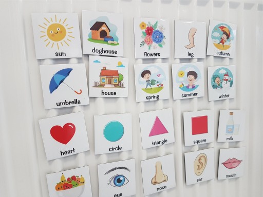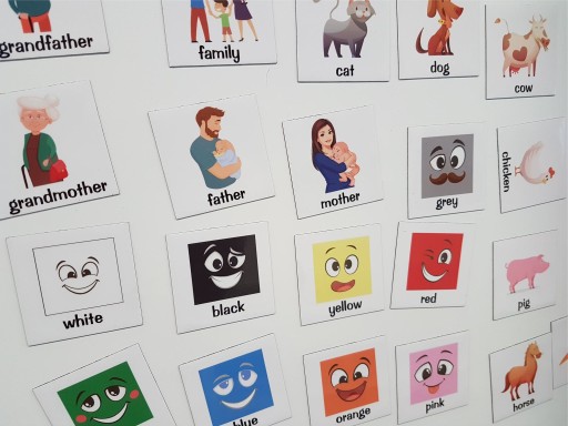 Zestaw 81 szt - magnesów do nauki j. angielski - wszystkie elementy mają jednakową wielkość. Kwadraty o szerokości boku 6 cm.