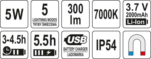 Lekki, ładowalny i przenośny reflektor służący do oświetlania miejsca pracy w warsztacie lub na budowie. Wysoka moc zapewni strumień świetlny o wartości 300lm a pojemny akumulator umożliwia pracę aż do 5,5h. Dodatowym atutem jest wodoodporność (IP54) oraz aż 4 tryby świecenia.