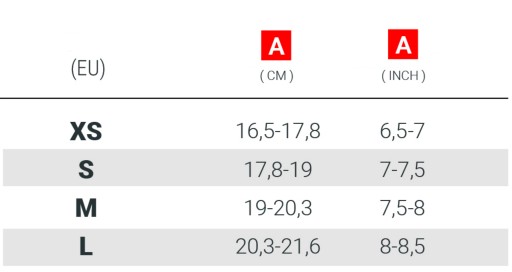 A: OBWÓD DŁONI - Zmierz obwód dłoni tak, aby lekko napięta taśma przechodziła przez kostki w ich najszerszym punkcie pomijając kciuk