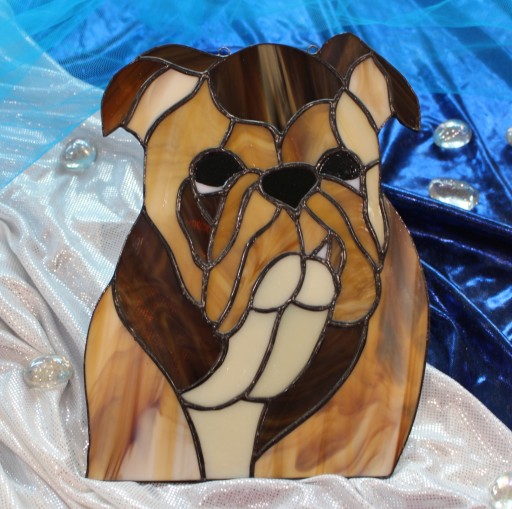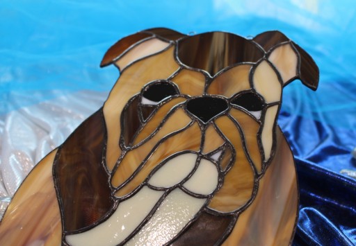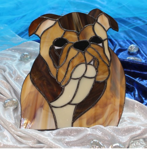 Buldog angielski z witrażowego szkła wykonany ręcznie przez wprawnych, polskich rzemieślników. Kawałki szkła połączone są miedzią i zapatynowaną na czarno cyną. Witraż zmienia kolorystykę w zależności od podświetlenia z tyłu. Może wisieć na oknie lub na ścianie.
