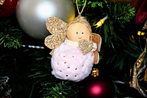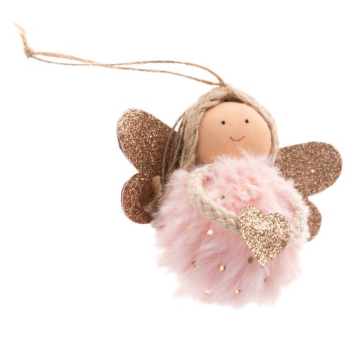 Różowa zawieszka w kształcie aniołka ze złotymi skrzydełkami stanowić będzie piękną ozdobę choinkową.