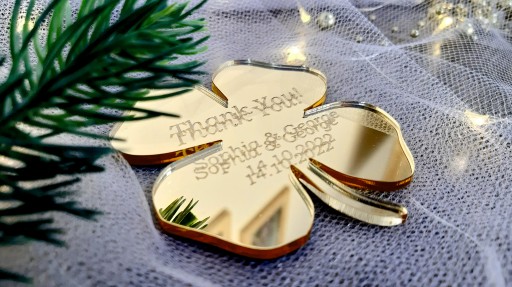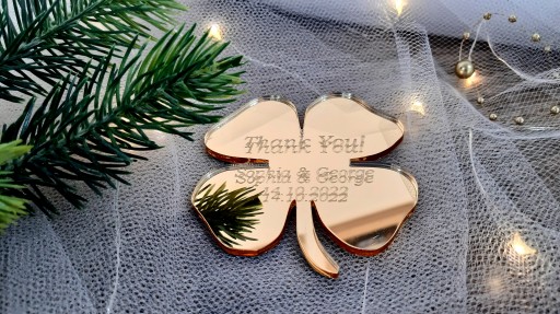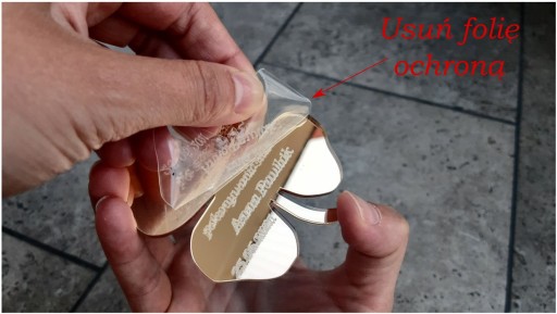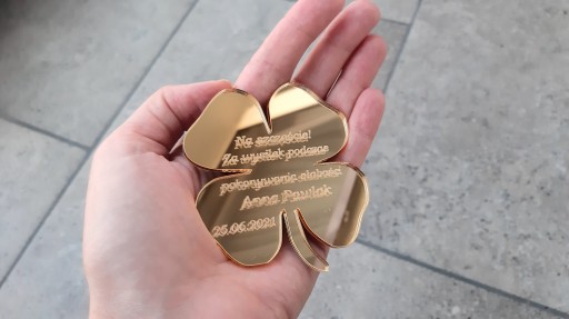 Na każdej koniczynce zostawiamy folię zabezpieczającą przed porysowaniem. Przed ich wręczeniem należy usunąć folię ze strony grawerowanej. Po stronie z magnesem nie ma folii.