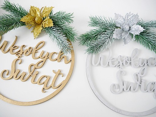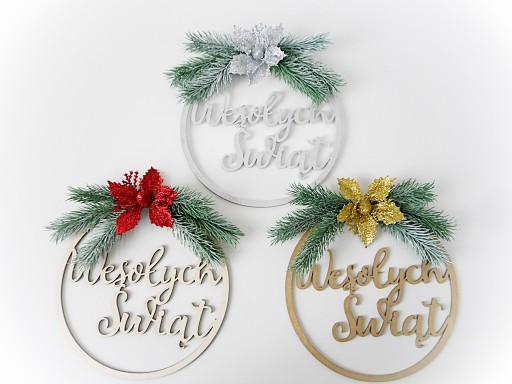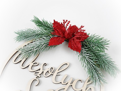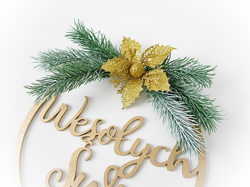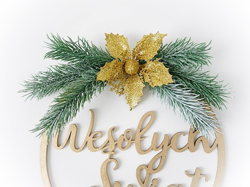 PIĘKNY STROIK ŚWIĄTECZNY wykonany na drewnianej obręczy z napisem Wesołych Świąt