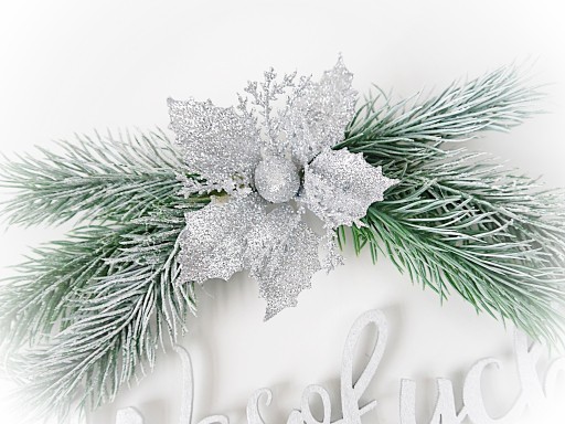 - Ozdoby: brokatowe kwiaty (gwiazda betlejemska), sztuczne świerkowe gałązki, oszronione