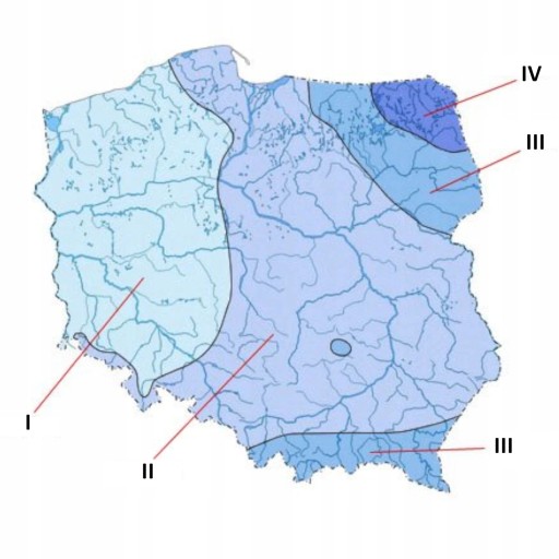 Powierzchnia Polski jest podzielona na strefy przemarzania, od I do IV.