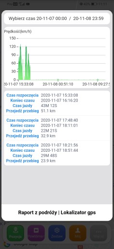 - Podgląd pokonanej trasy, prędkość, przebieg, czas parkowania itp.