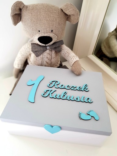 Oferujemy drewniane pudełko wspomnień na roczek dziecka z przegródkami wykonane z niezwykłą starannością o każdy detal.