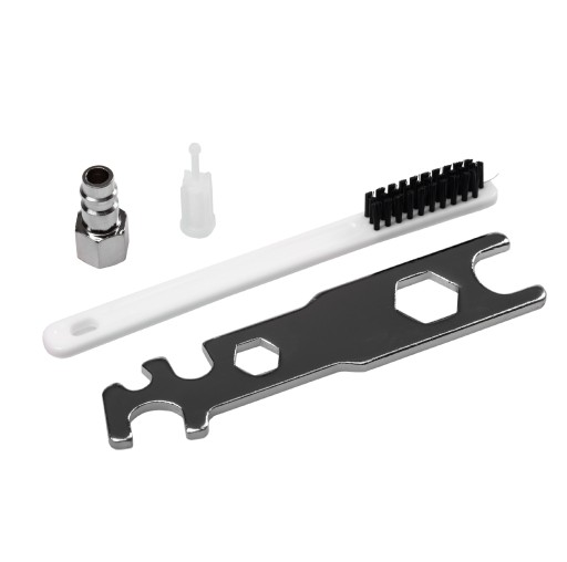 Korpus wykonany jest z wysokiej jakości aluminium, a igła i końcówka ze stali nierdzewnej. Pistolet nie posiada oringów, a wszystkie uszczelki są wykonane z teflonu. Dzięki temu można pracować z różnymi płynami nie obawiając się o wycieki czy rdzę.