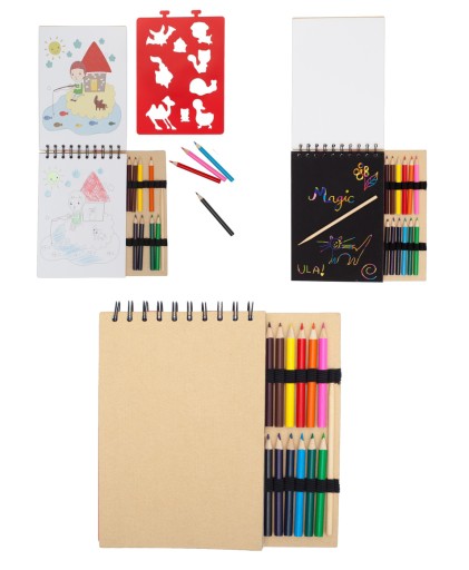 Zestaw kreatywny dla dzieci, składający się z kolorowanek, zdrapek, kredek, i kartek do rysowania. Idealny prezent dla każdego dziecka, rozwijający wyobraźnie i zdolności manualne.