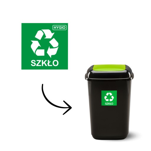 Kosz na odpady szklane z zieloną naklejką oraz zieloną ruchomą pokrywą.