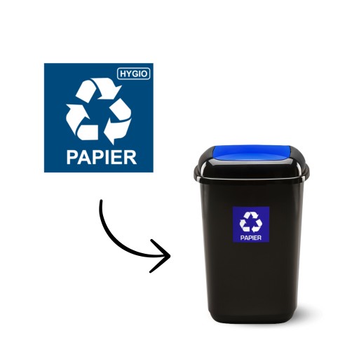 Kosz na odpady papierowe z niebieską naklejką oraz niebieską ruchomą pokrywą.