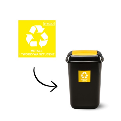 Kosz na odpady plastikowe i metale z żółtą naklejką oraz żółtą ruchomą pokrywą.
