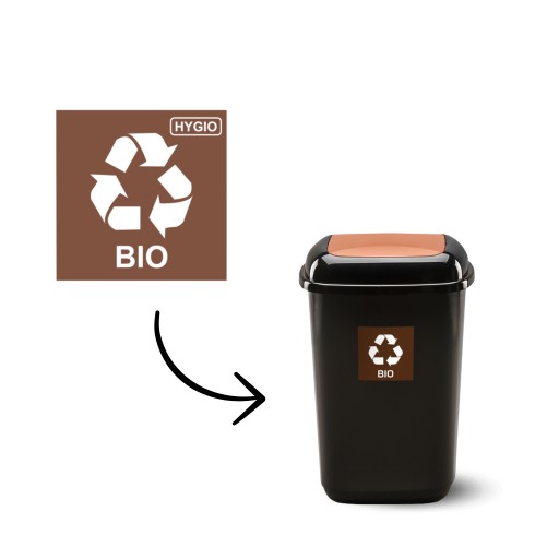Kosz na odpady biodegradowalne z brązową naklejką oraz brązową ruchomą pokrywą.