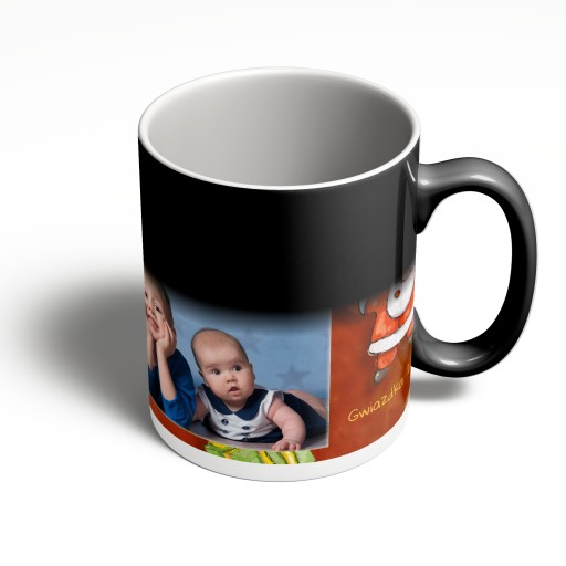 Kubek jest czarny i pod wpływem temperatury ukazuje się nadruk (np. po zalaniu go gorącą wodą, herbatą, kawą).