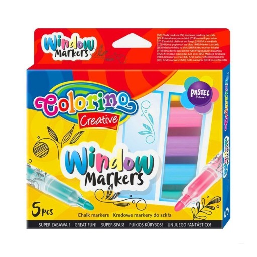 Kredowe markery do szkła w 5 neonowych kolorach. Nie potrzeba żadnych dodatkowych akcesoriów ani wody! Idealne dla małych artystów. Bez wody, bez kapania, bez bałaganu! Pozwalają na bezinwazyjne ozdabianie okien i luster. Zmywalne za pomocą zwilżonej wodą szmatki lub gąbki.