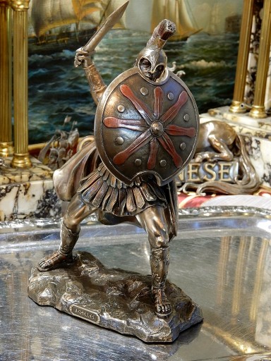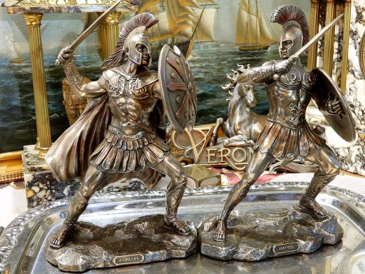 Zapraszam do zakupu wspaniałego zestawu dwóch figurek, Herosa Trojańskiego, królewicza Hektora syna Priama walczącego z Achillesem , greckim wojownikiem, wodzem Myrmidonów. Całość fantastycznie się prezentuje , figurka bardzo realistyczna .Przedmiot wykonany z materiału typu polirezin, to mieszanina żywicy i kamienia, pokryty brązem i ręcznie malowany. Kolekcja VERONESE , markowy produkt najwyższej klasy. Zwróć uwagę na niezwykle precyzyjne wykonanie Przedmiot znacznie lepiej wygląda w naturze .To może być oryginalny pomysł na prezent