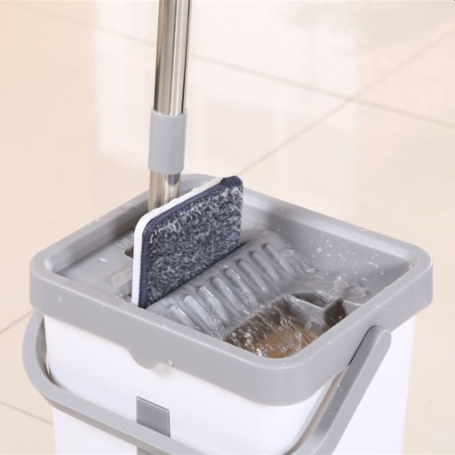 ▶ Wyjątkowo skonstruowany mop, który nie wymaga dużej ilości wody, posiada wiaderko dwukomorowe na czystą i brudną wodę, a wyciskacz oddziela nieczystości, które spływają do pojemnika z brudną wodą.